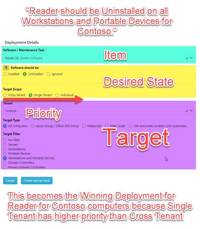 Result: When maintenance runs on Contoso computers, Adobe Reader will be uninstalled and Adobe Acrobat will be installed, even if you have a global deployment that normally installs Adobe Reader on all computers.