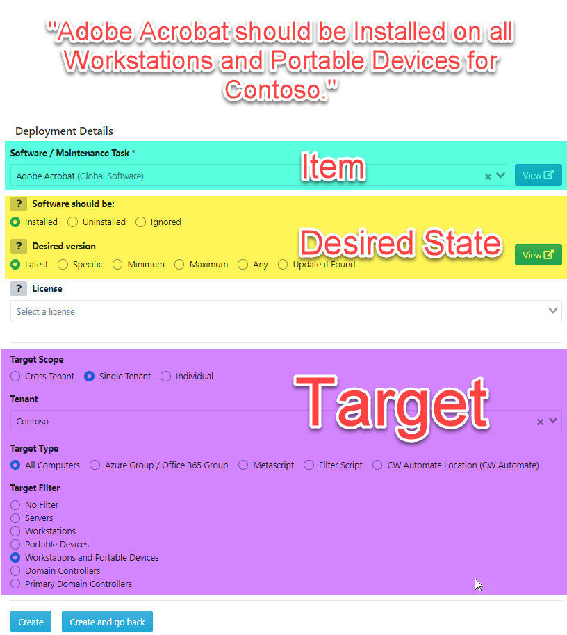 Step 1: Create a Deployment that sets the desired state of Adobe Reader to Uninstalled for Contoso