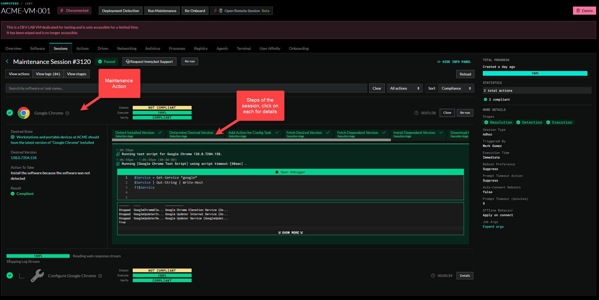 During the Detection Stage, ImmyBot “Detects” which Maintenance Actions are necessary to bring the computer into compliance. These Actions are added to the Maintenance Session.