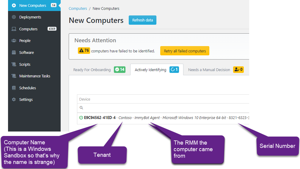 Because the same computer often exists in multiple RMMs (Like how CW Automate typically installs ConnectWise ScreenConnect Automatically), ImmyBot prevents duplicates by identifying the computer by a unique id. We DO NOT use MAC Address! This unique id persists even if you wipe and reload the machine.