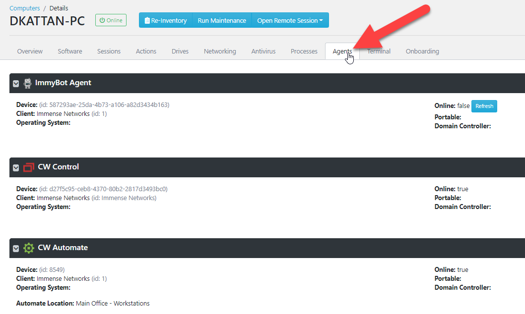 If it is a machine ImmyBot has seen before, it will be associated to the existing Computer, and you will find a new entry under the Computer’s Agents tab. Under the hood we call these entries “RmmComputers”.