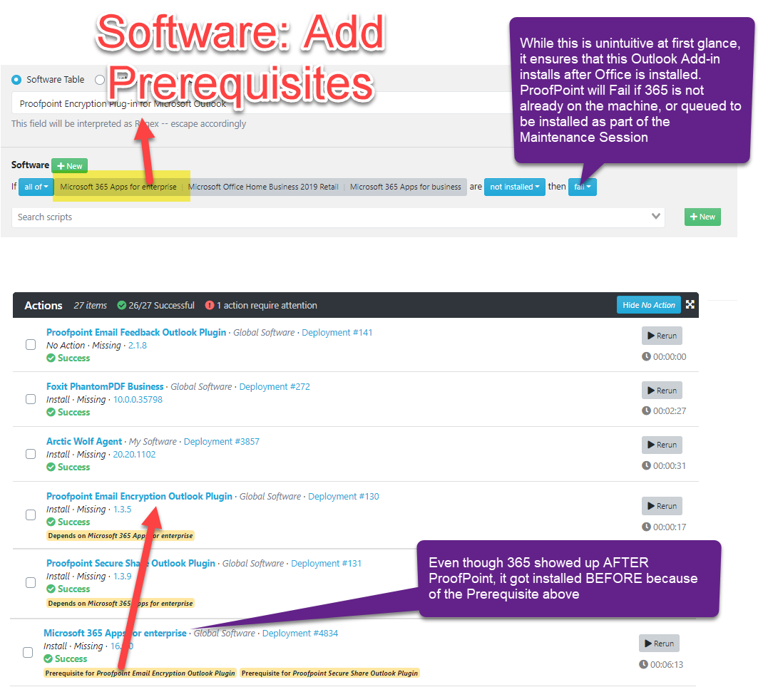 This also provides a cohesive mechanism for setting up a new computer. At best in traditional RMMs you can assign Monitors that detect the absence of required software and run Install scripts when they are missing, but this doesn’t scale as pre-requisites and exclusions are required.