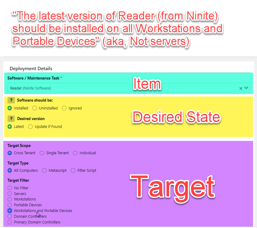 A deployment is a rule that assigns Software or Tasks (collectively known as “Maintenance Items”) to a Target. Deployments define what should be installed, configured, or maintained on specific computers or for specific users.
