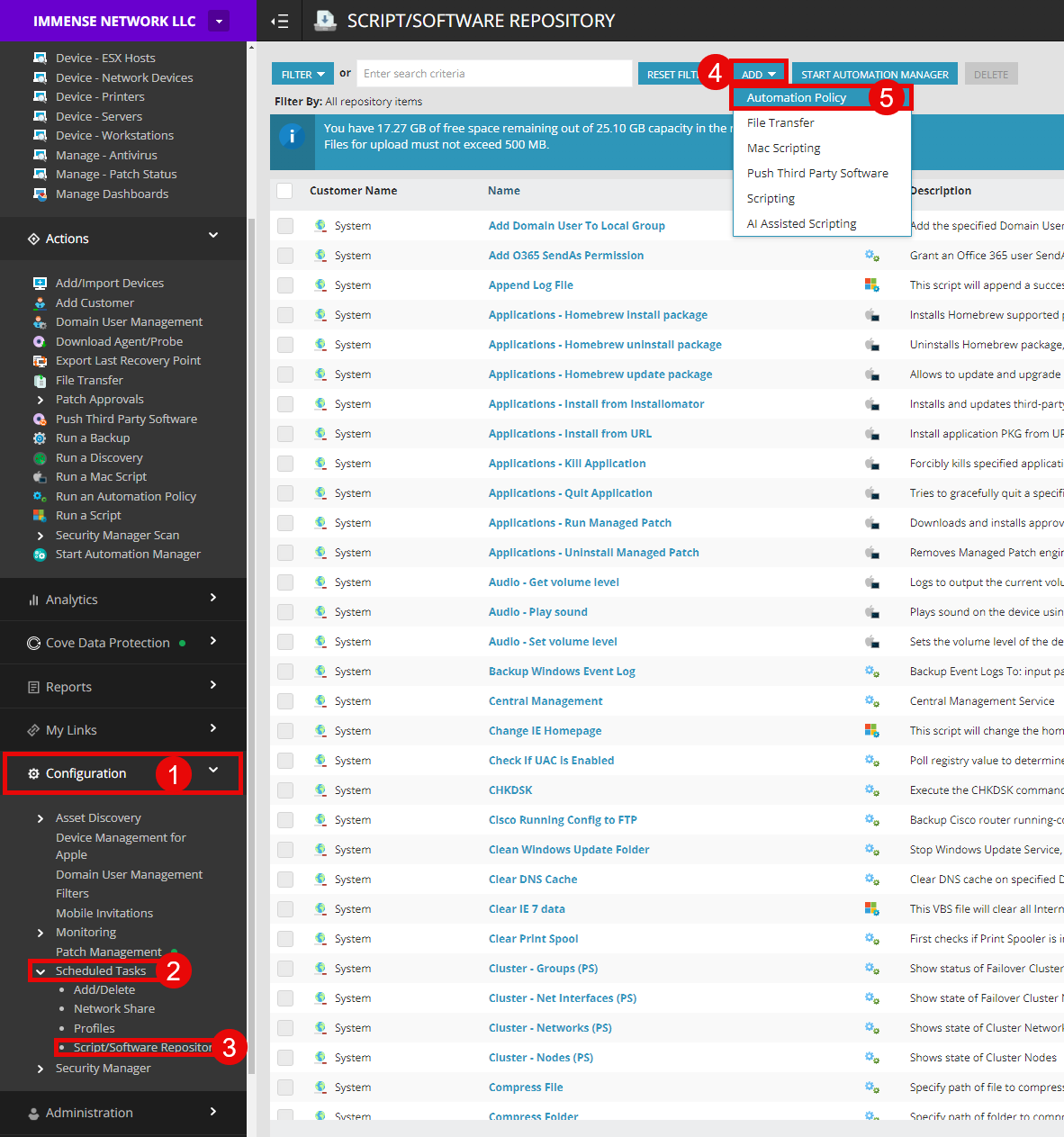 First, navigate to the “Script/Software Repository” under “Schedules Tasks” beneath the “Configuration” tab in N-Central.
