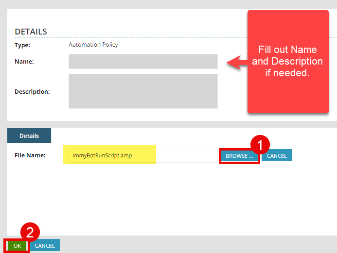 Second, download the ImmyBot RunScript Automation Policy and upload it to your instance. Fill out the Name and Description how you see fit if required.