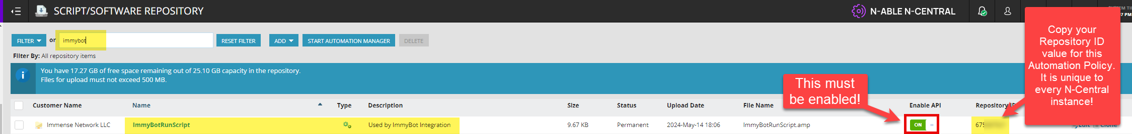 Find the automation by searching for “ImmyBot”, then flipping the Enable API switch. Accept the confirmation modal, then copy the Repository ID for later use.